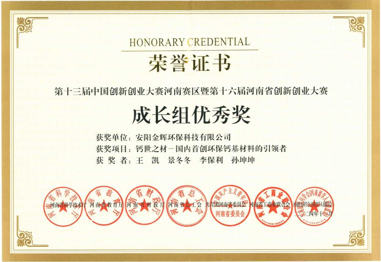 由河南省科技厅主办,省教育厅、省财政厅、省总工会、团省委、省工商联、河南欧美同学会(河南留学人员联谊会)联办的第十三届中国创新创业大赛河南赛区暨第十六届河南省创新创业大赛圆满结束,taptap点点安阳市科技特派员王凯老师(第一完成人)与安阳金辉环保科技有限公司合作参赛项目《钙世之材-国内首创环保钙基材料的引领者》获得成长组优秀奖。